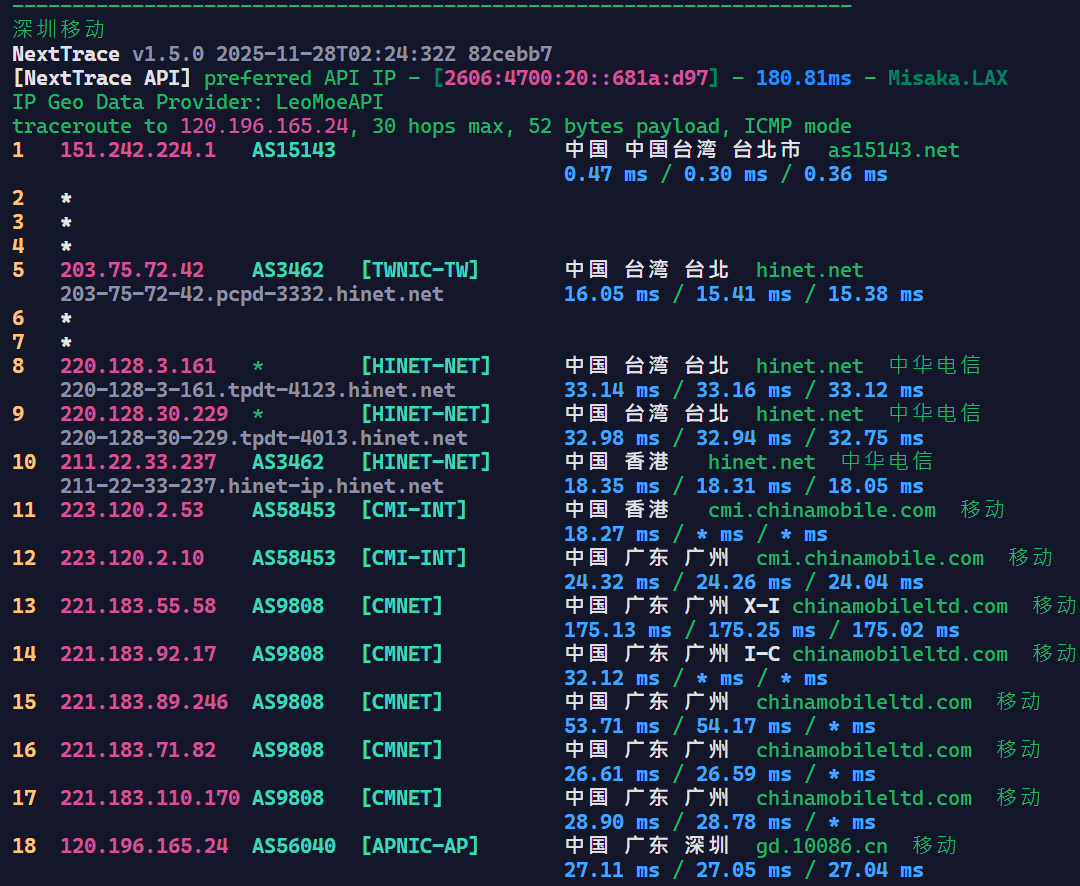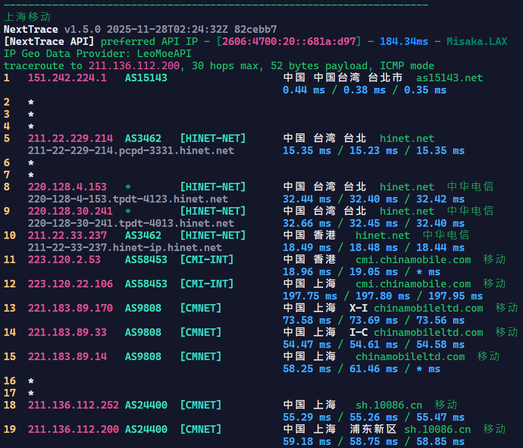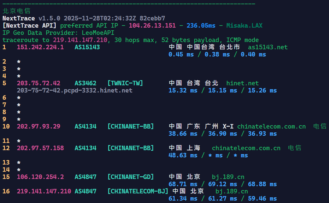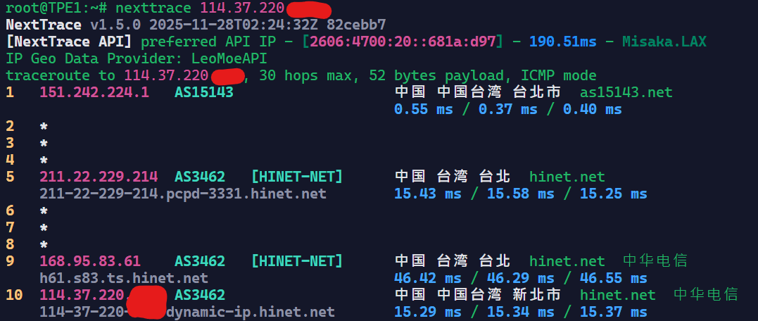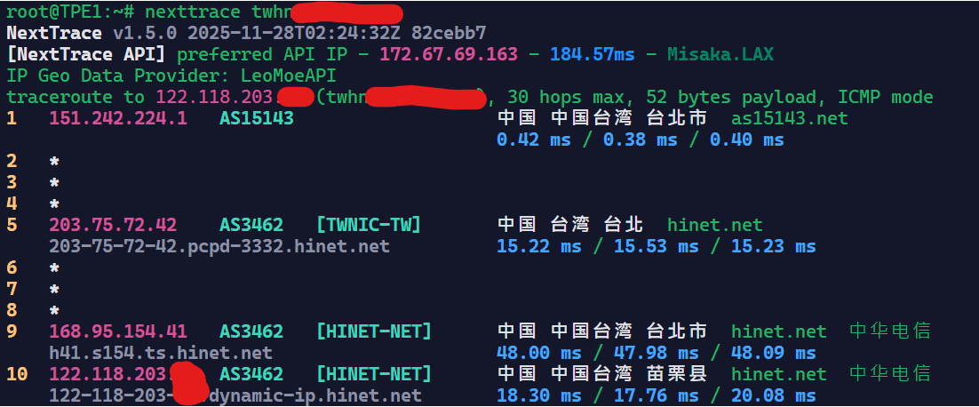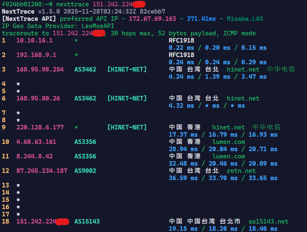 可以看到基本上是走Hinet回内地的,Hinet在回内地的线路上还是很不错的。
