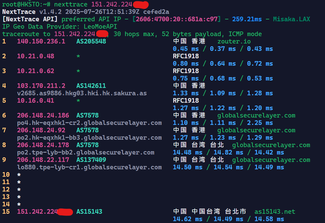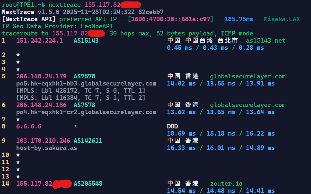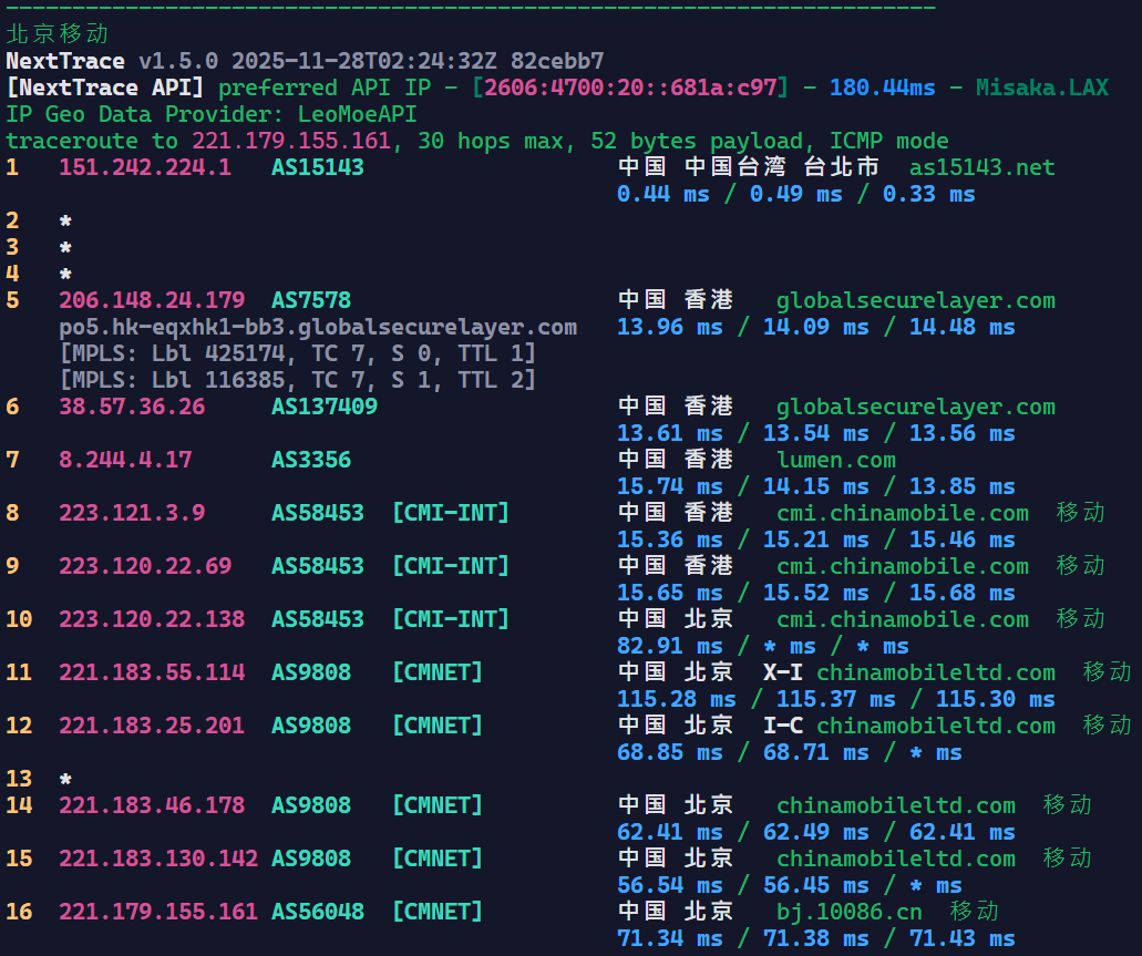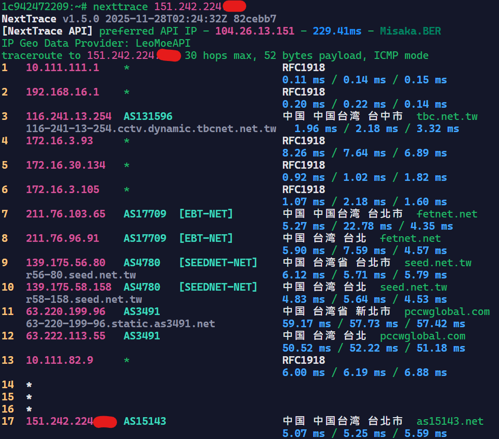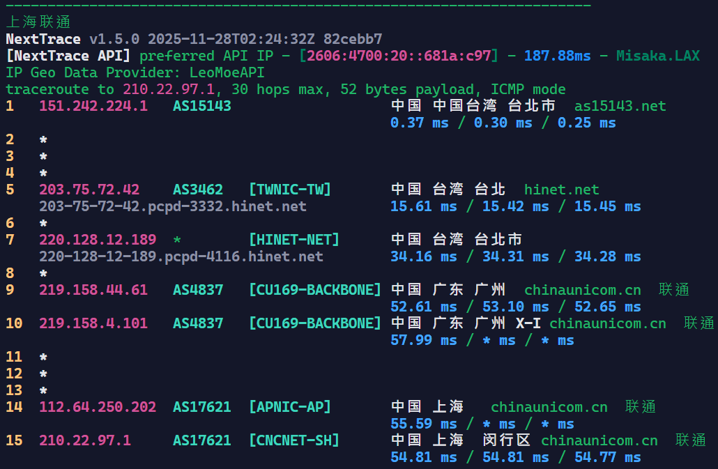 可以看到基本上是走Hinet回内地的,Hinet在回内地的线路上还是很不错的。