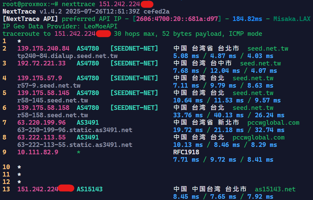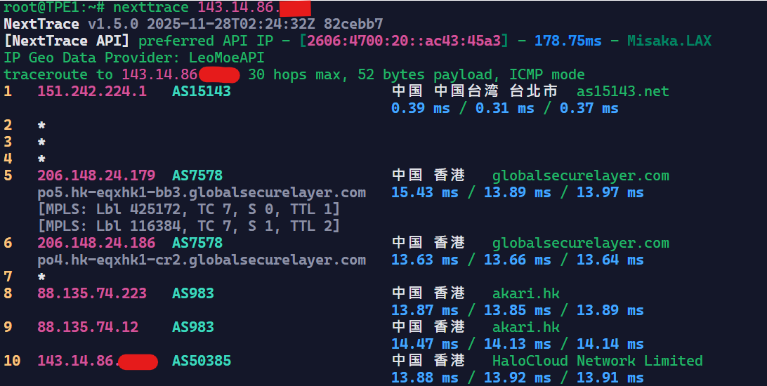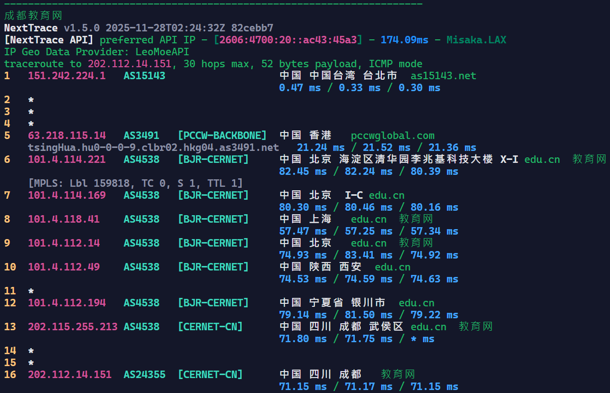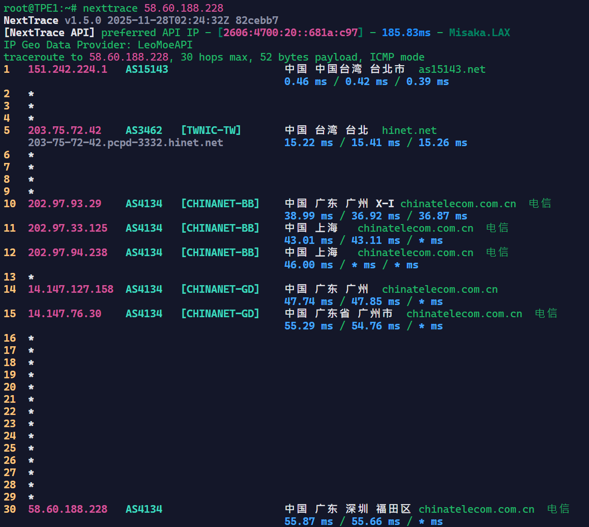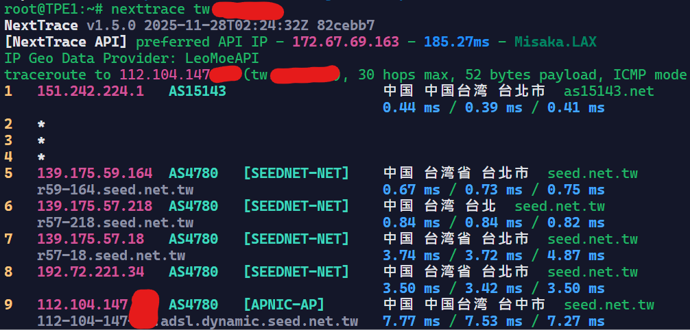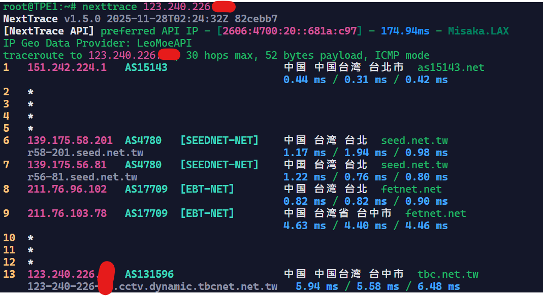 可惜他到台湾Hinet是绕路的,到Seednet和Seednet下游的TBC是直的。不过一分钱一分货,Hinet不直很正常。