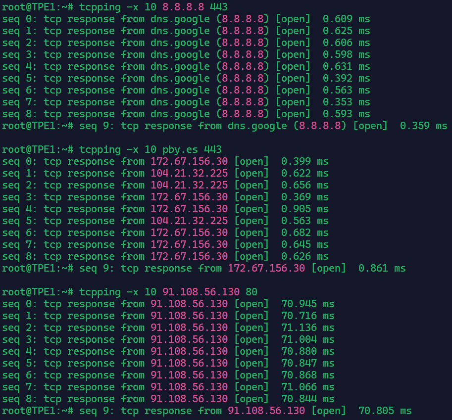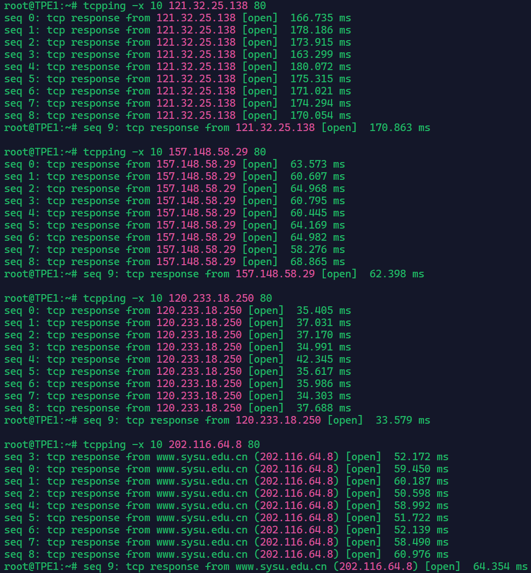 到广州四网tcping(从上至下分别为电信、联通、移动、教育网)以及到谷歌、cf、telegram dc5 tcping情况: