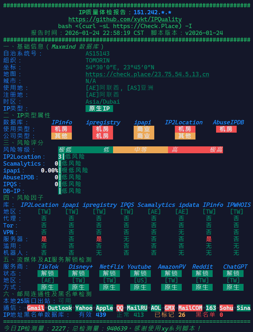 首先看一下这台VPS的解锁流媒体情况(bash <(curl -L -s https://github.com/1-stream/RegionRestrictionCheck/raw/main/check.sh))、IP质量(bash <(curl -Ls https://Check.Place) -I)(此VPS为双栈鸡):
