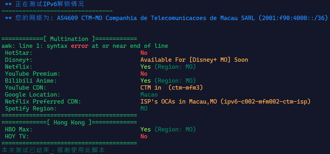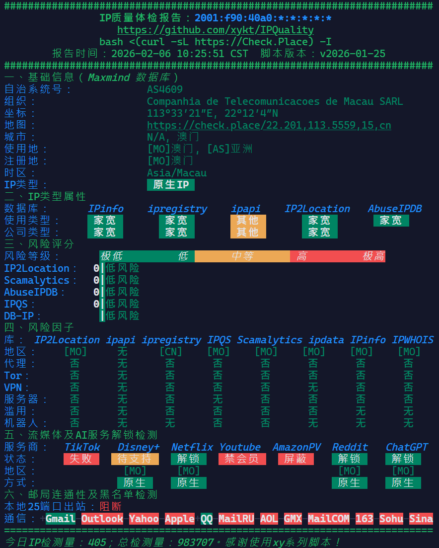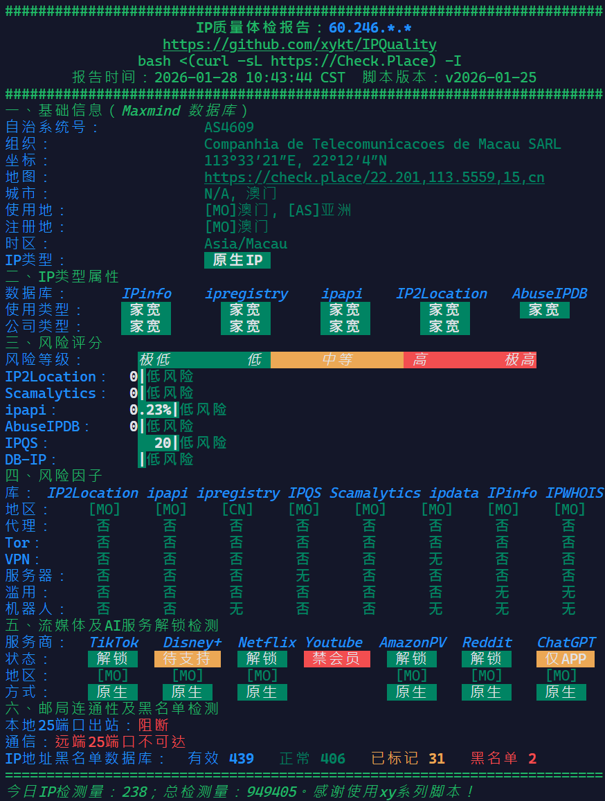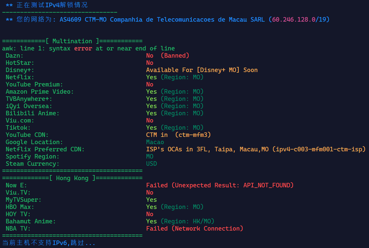首先看一下这台VPS的解锁流媒体情况和IP质量(IPv4是动态的)(用的解锁脚本链接真爱粉都知道):