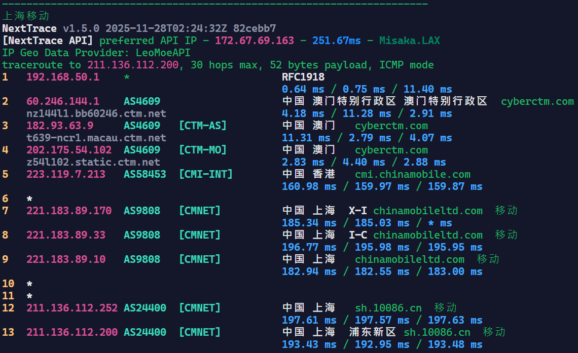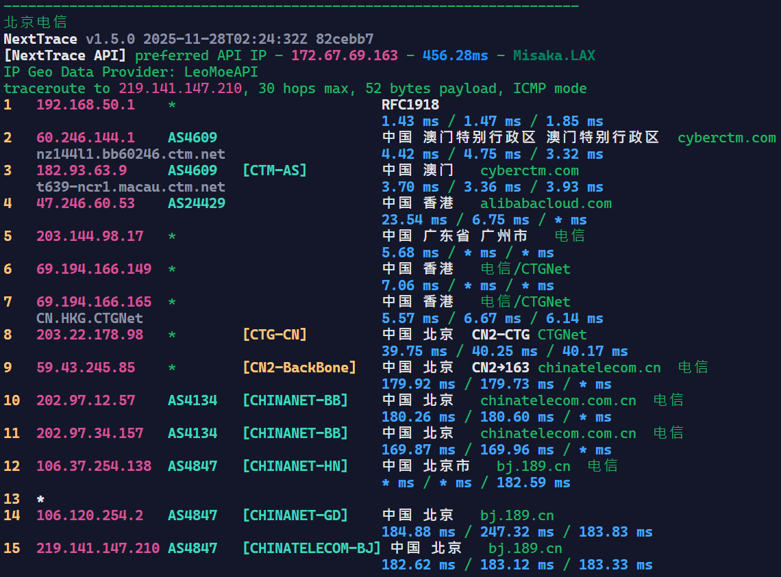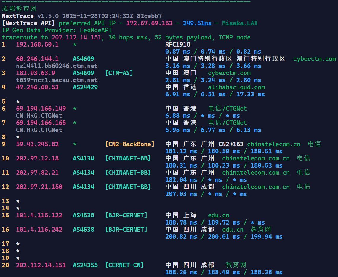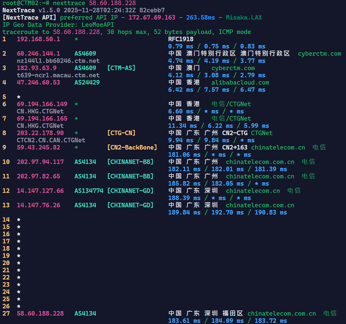CTM现在很多IP段到中国内地都绕路,刷到优化线路的IP段很吃运气,我们直接看这台机器的IP的回程延迟路由情况: