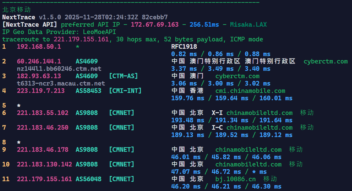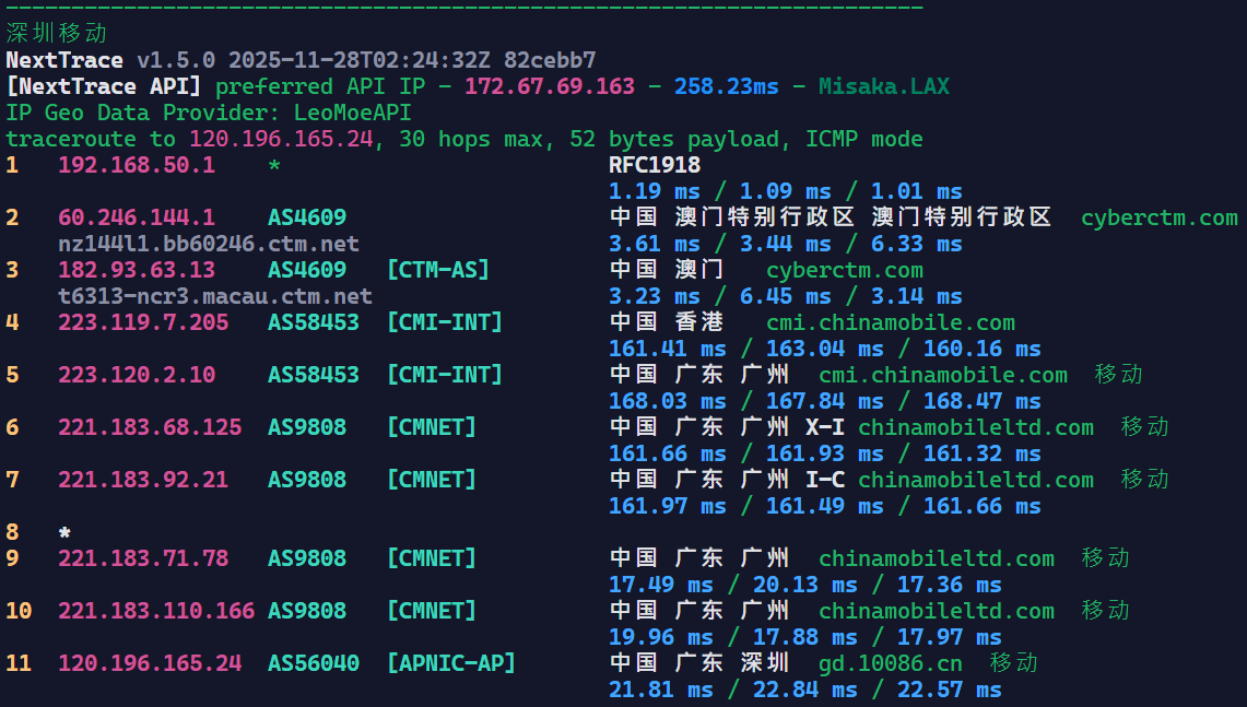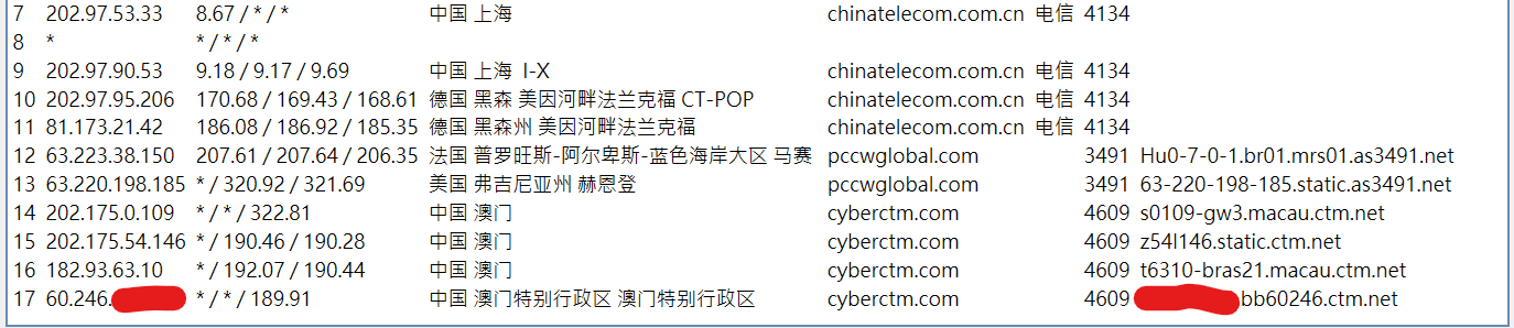 可以看到四网全球绕路,只有部分地区部分移动IP段运气好能直连。