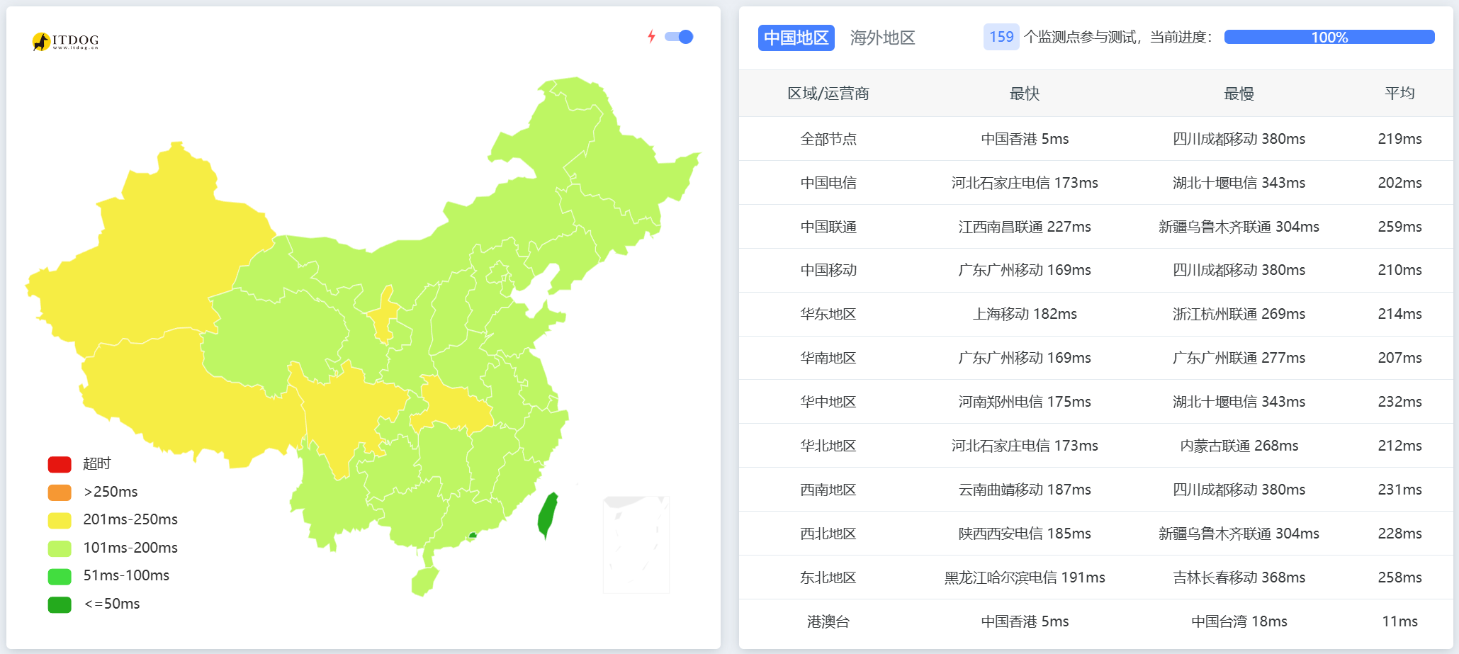 全国其他地方只能测测三网延迟,就用itdog.cn的结果了: