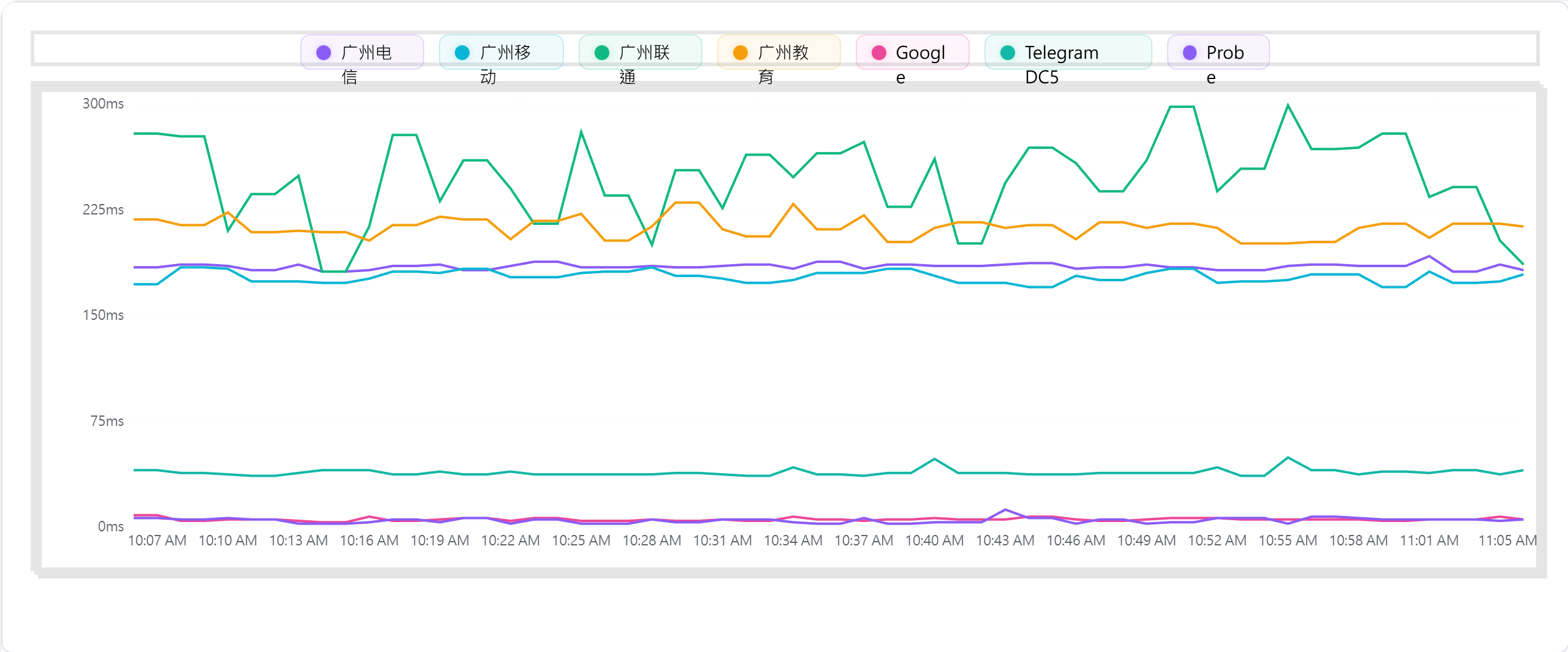 到广州四网以及到谷歌、cf、telegram dc5 tcping情况: